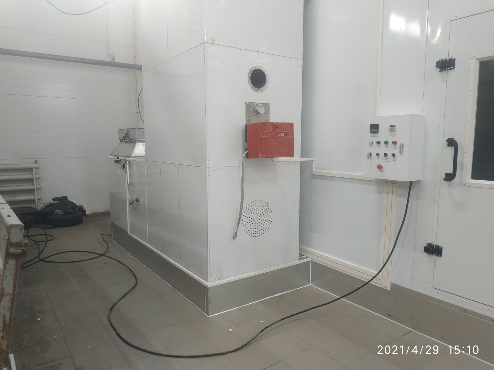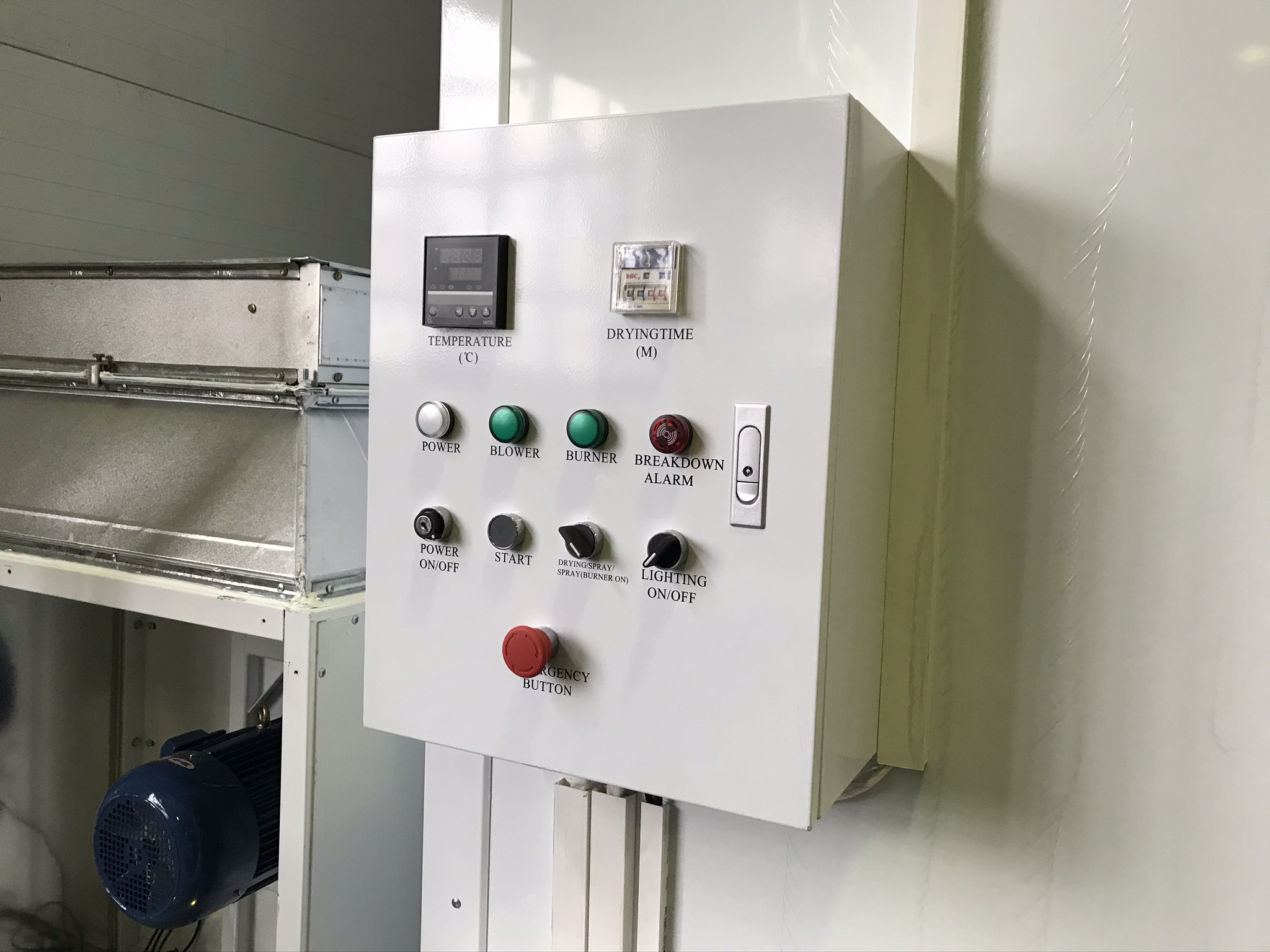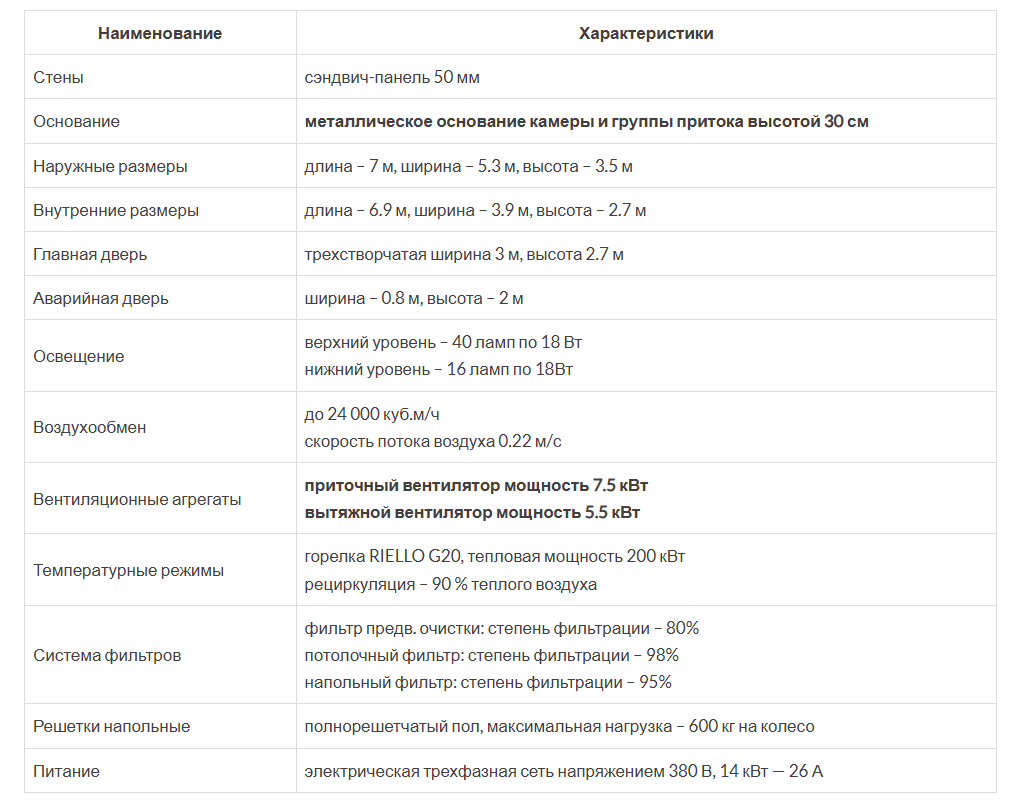 На данной модели покрасочной камеры используется дополнительное боковое освещение, оно включает в себя 8 плафонов, в каждом по 2 лампы мощностью по 18 Вт каждая. Блок управления и его компоненты импортного производства, они защищены от перегрузки, перегрева и пропадания фазы, мотор с линейным приводом. При истечении заданных значений времени, работа камеры автоматически прекращается. Покраска происходит при постоянной температуре. Питание камеры осуществляется посредством трёхфазной сети с напряжением 380 В, мощность установки 14 кВт.