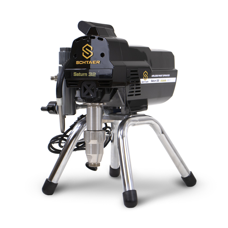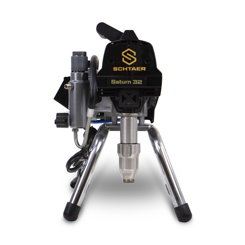 Sсhtaer Saturn 32 — окрасочный аппарат безвоздушного распыления используется для работы на строительной площадке, для покраски фасадов, стен и потолков, грунтовки и окраски металлоконструкций, и покраски деревянных стен и заборов. Поршневой окрасочный аппарат забирает краску из ведра и подает ее по шлангу высокого давления на краскопульт.